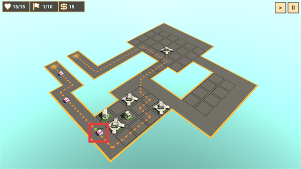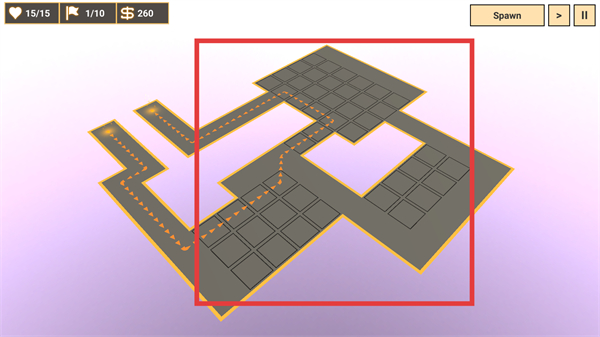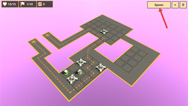 2、点击【Spawn】触发敌人进攻,同时在路径旁部署防御塔,借助塔的攻击拦截敌方单位,积累资源。