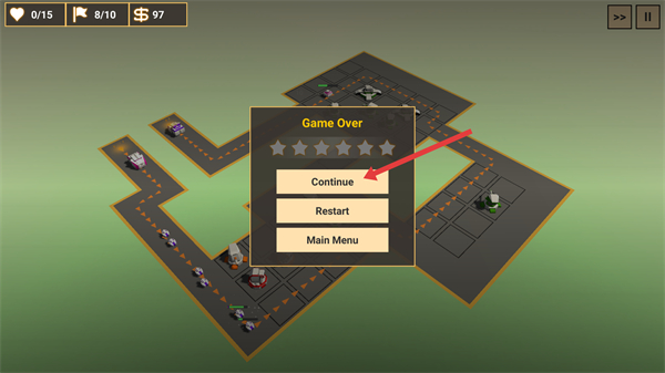 4、游戏结束后选择【Continue】继续挑战,优化防御塔部署策略。