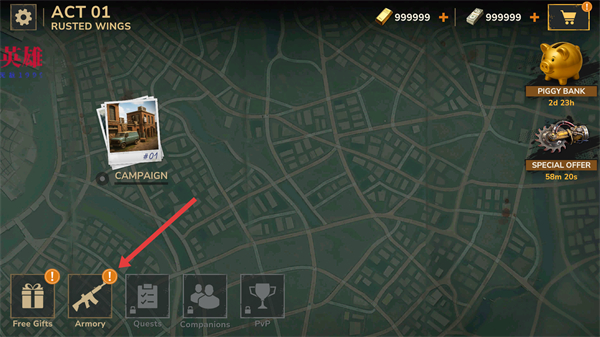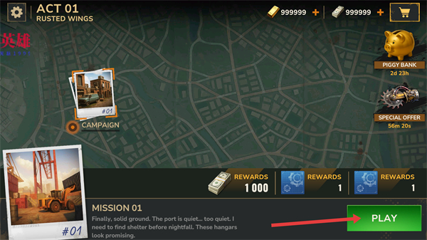 4、返回地图界面,点击【PLAY】按钮,进入【MISSION-01】开始战斗,在港口场景中消灭僵尸,完成任务获取奖励。