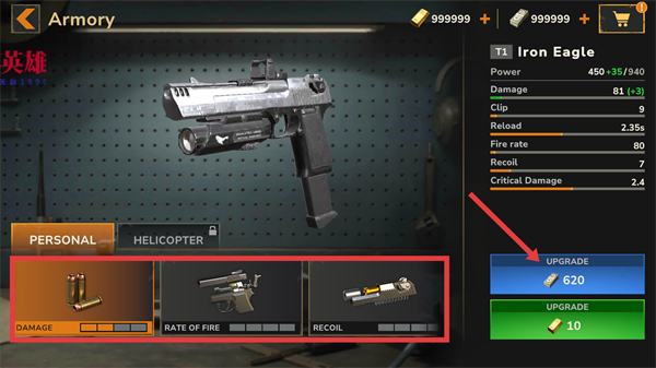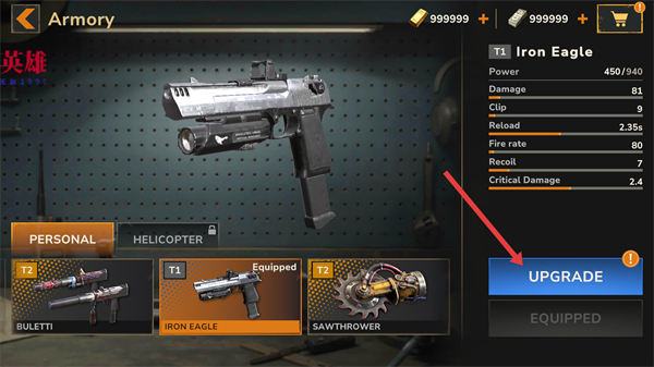 2、在武器库中选择武器(如Iron-Eagle),点击【UPGRADE】按钮升级武器,提升武器性能。