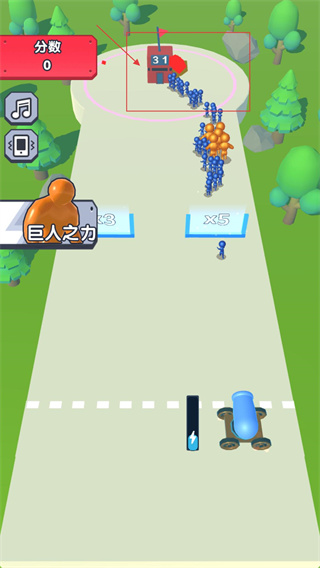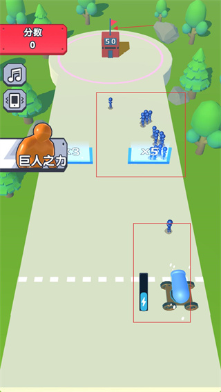 2、移动过程中接触蓝色小人可将其收纳,同时可拾取“×5”等增益道具,这类道具能倍数提升收集的单位数量,快速扩大队伍规模。