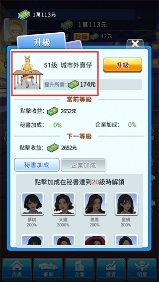 2、点击【升级】按钮,花费【174元】将角色升级至【51级-城市外賣仔】,增强资源获取效率。