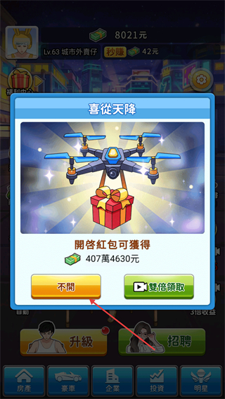 3、触发【喜從天降】事件后,可选择【不開】跳过,或观看广告解锁红包,获取【407萬4630元】的巨额资源奖励。