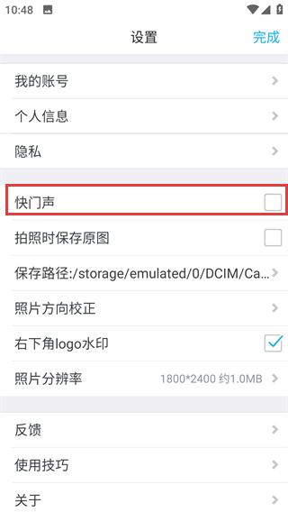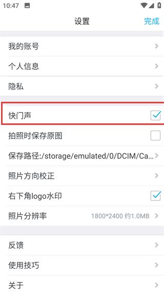 2、在设置页找到【快门声】选项,点击其右侧的勾选框取消勾选。