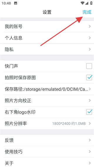 4、点击设置页右上角的【完成】按钮,保存设置并返回相机主界面。