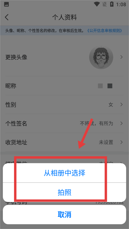 4、选择【从相册中选择】或【拍照】,完成头像更换操作。