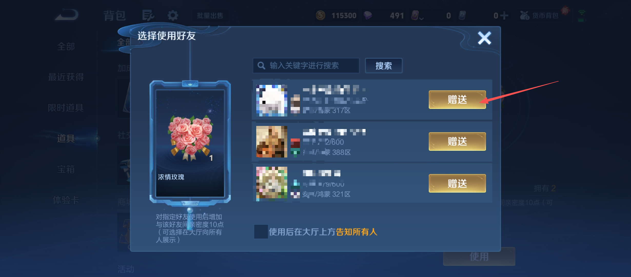3、在选择使用好友界面,找到目标好友,点击【赠送】按钮,使用道具增加亲密度哦。