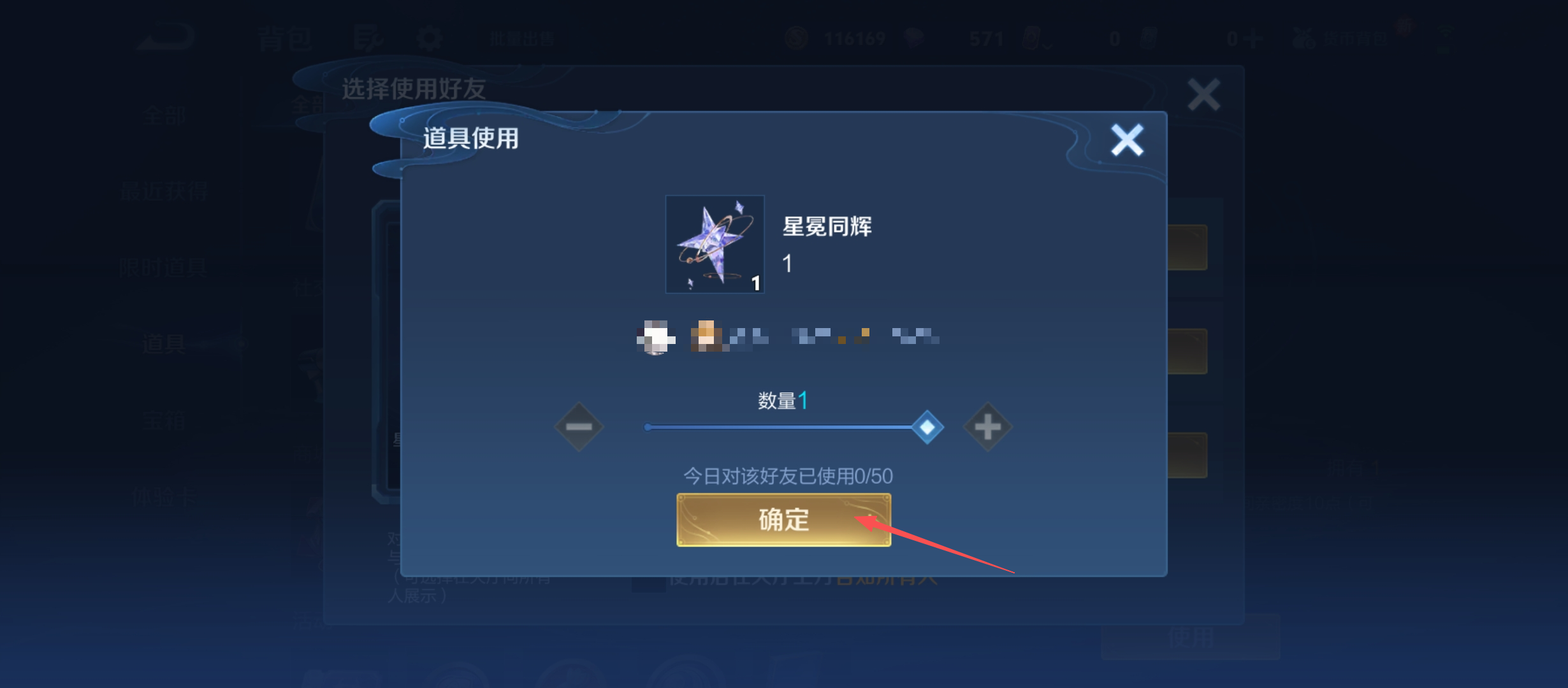 4、还可以使用别的亲密度道具,点击【确定】按钮,即可给好友使用道具,提升彼此亲密度。