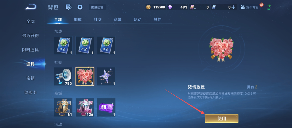 2、打开背包,找到可增加亲密度的道具,如【浓情玫瑰】,点击【使用】按钮呀。