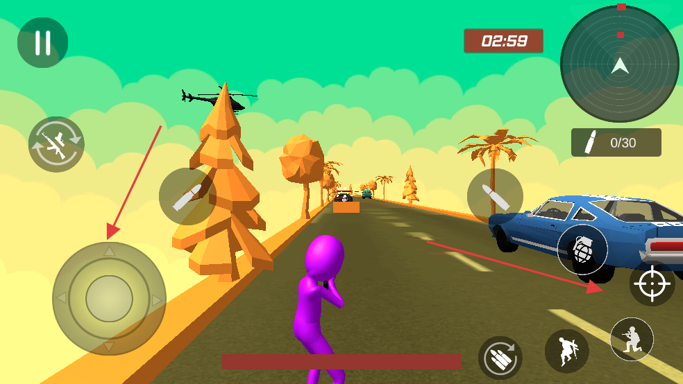 2、战斗中利用左侧摇杆移动角色,右侧功能键切换武器,灵活走位躲避敌人攻击,同时瞄准敌人车辆发起进攻。