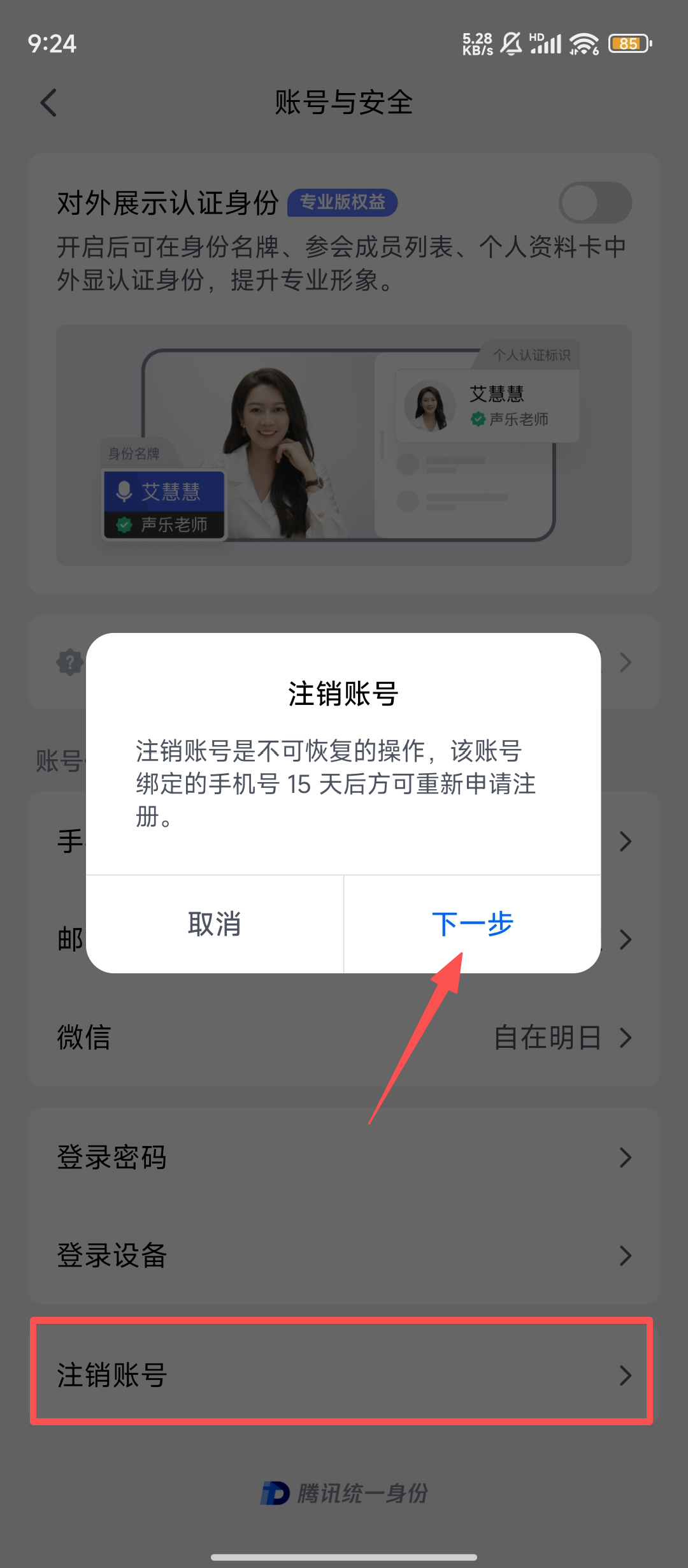 1、进入腾讯会议【账号与安全】页,点击【注销账号】,在弹出的提示框里点【下一步】。