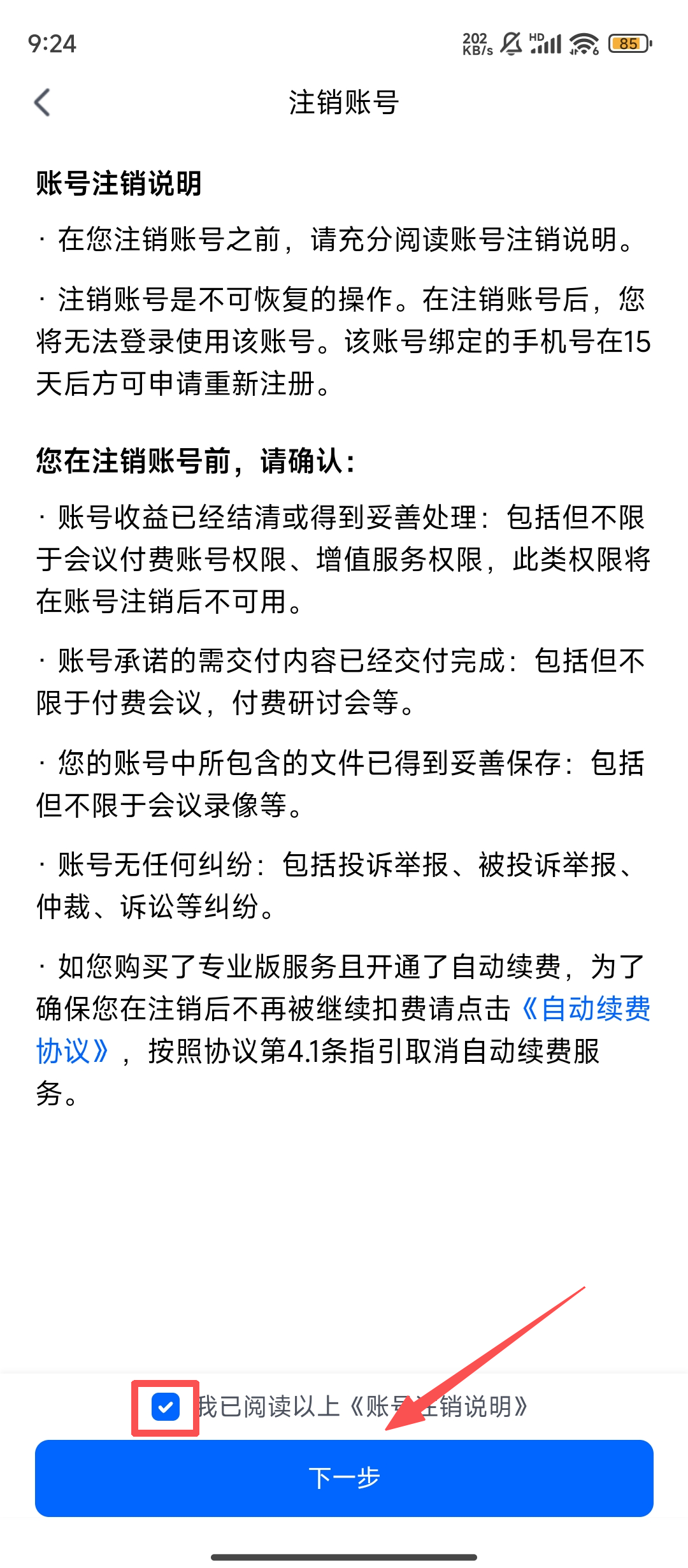 2、来到【账号注销说明】页,勾选【我已阅读以上账号注销说明】,再点【下一步】。