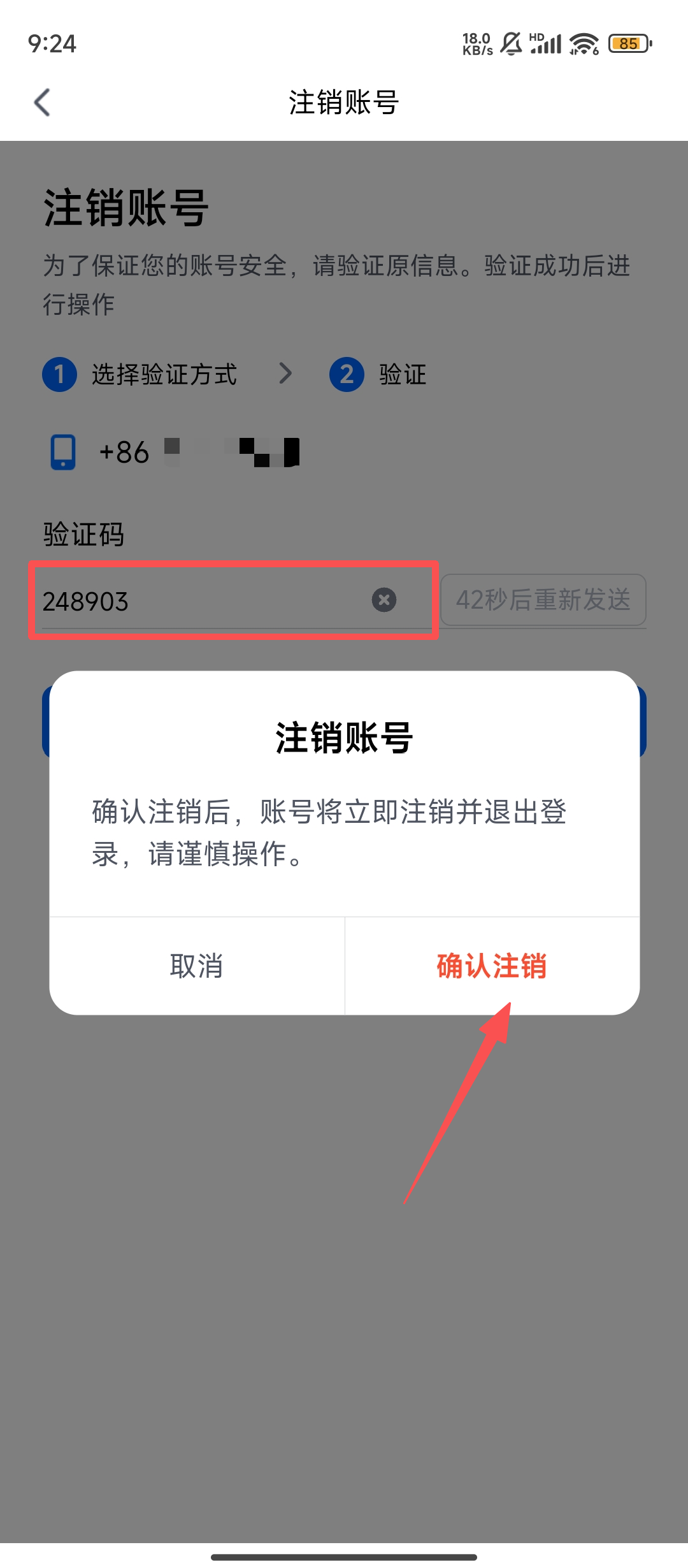 4、验证原信息后,在弹出的【注销账号】确认框中,点击【确认注销】完成操作。