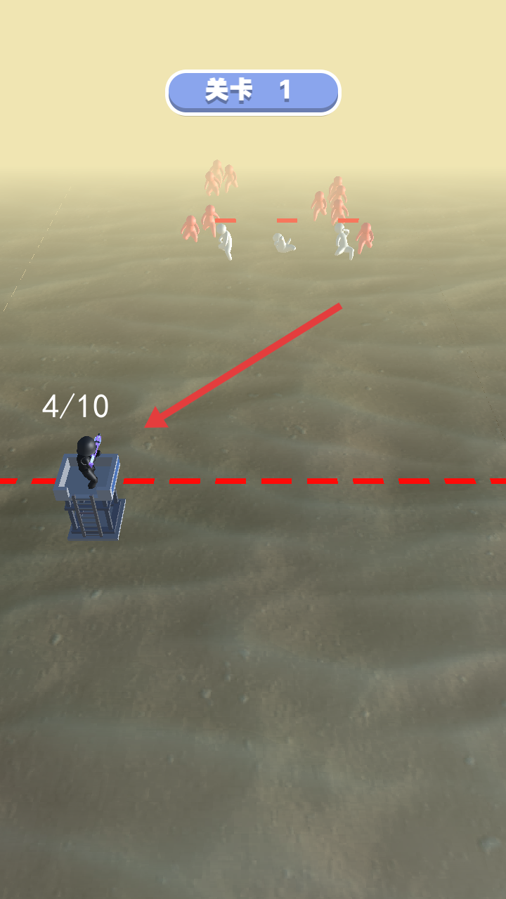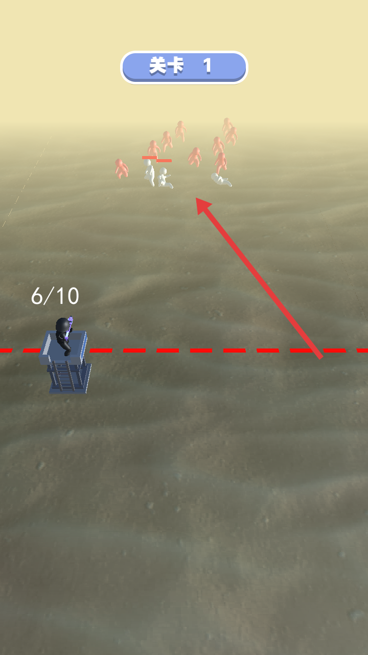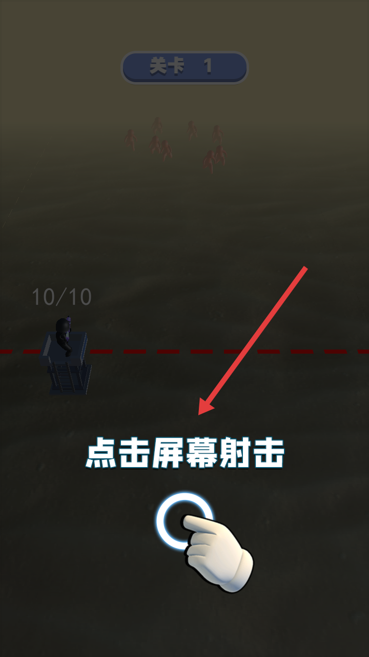 1、点击屏幕启动游戏,操控位于防御塔上的黑色角色展开射击,正式开启第一关的防御挑战。