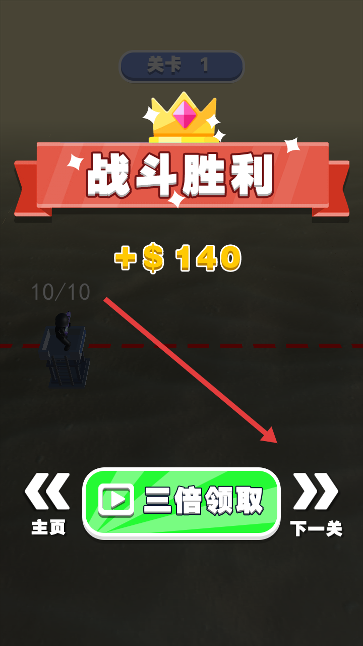 4、战斗胜利后,可选择观看广告以三倍领取金币奖励,也可直接点击进入下一关,继续挑战更多的防御射击关卡。