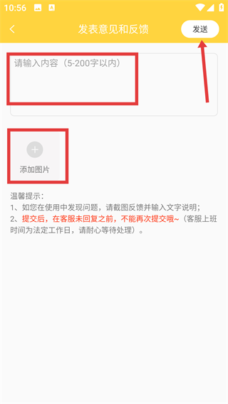 4、最后在发表页面,输入反馈内容并可【添加图片】,完成后点击【发送】,就能联系到人工客服啦。