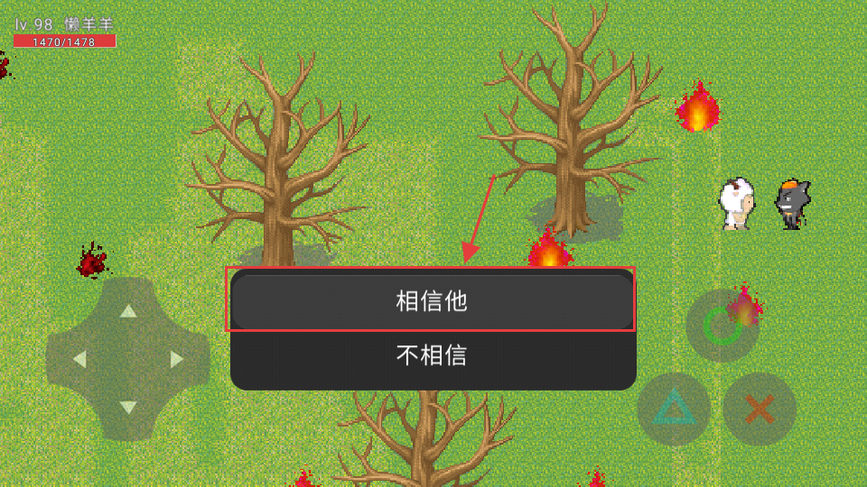 4、面对灰太狼的互动时会出现【相信他】-【不相信】两个选项,需根据剧情判断选择合适的选项推进。