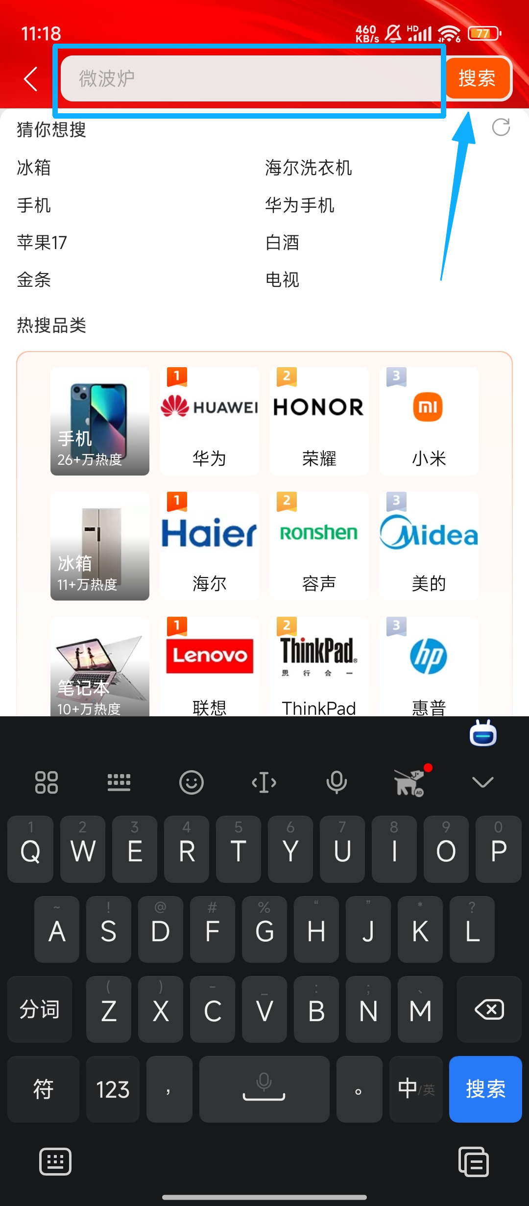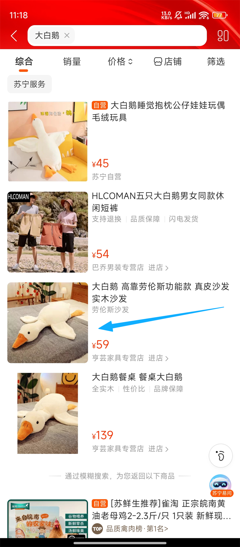 1、打开苏宁易购,在【搜索框】输入想买的商品名,再点击橙色【搜索】按钮,就能看到相关商品啦。