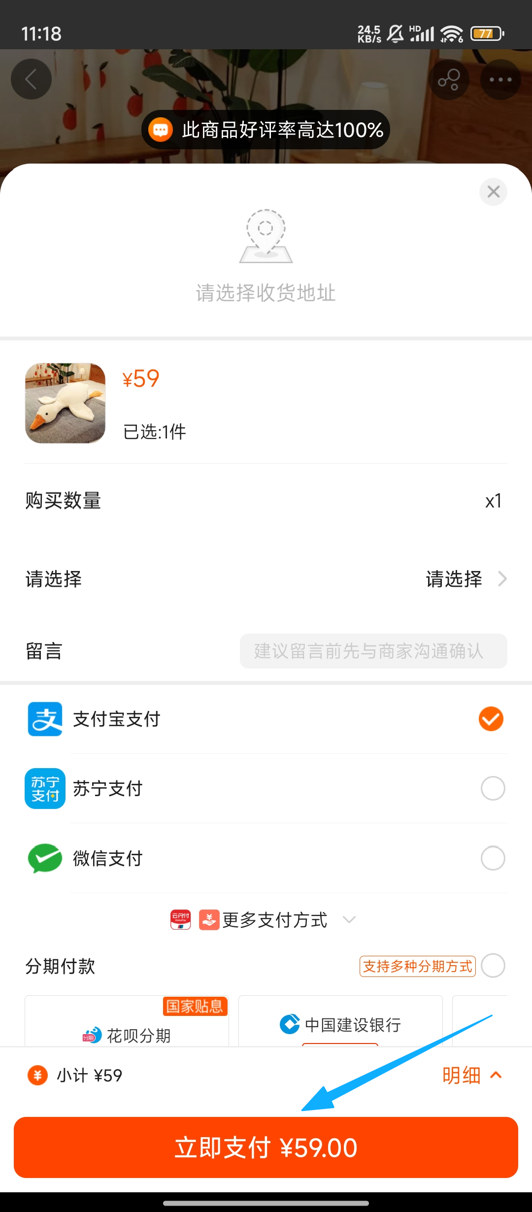 4、进入支付页面后,选择收货地址、购买数量和支付方式,最后点击【立即支付】按钮,就能完成购买咯。