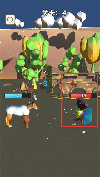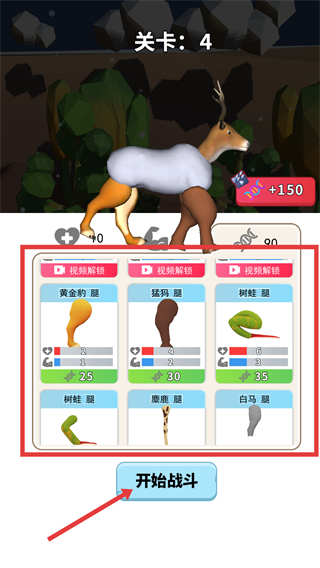 1、在关卡4中,从红色框内的动物腿部中选择组合,构建自己的合成动物,然后点击【开始战斗】按钮进入战斗。