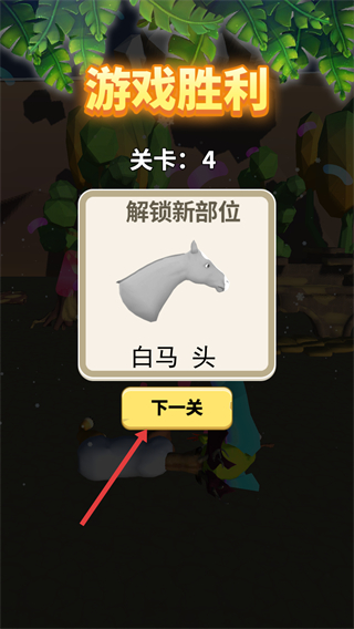 4、游戏胜利后,点击黄色【下一关】按钮,解锁新部件(如白马头)并进入下一个关卡。