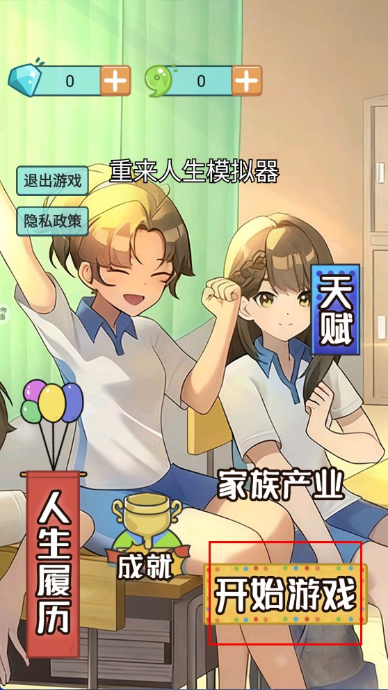 1、进入【重来人生模拟器】主界面后,点击【开始游戏】按钮,即可开启人生模拟养成的剧情之旅,开始新的人生选择。