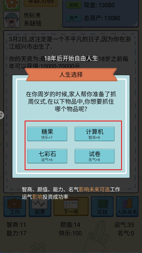 2、周岁抓周时,可选择【糖果】【计算机】【七彩石】【试卷】,计算机加智商更利于未来职业发展,建议优先选它。