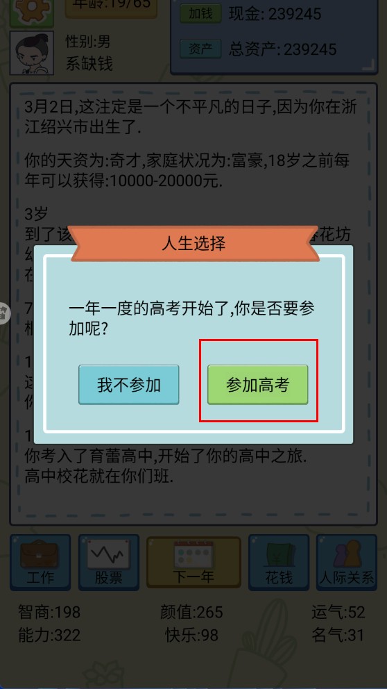 1、选出身定初始资产与剧情方向,看故事发展调后续计划,走不同养成路线解锁新故事情节。