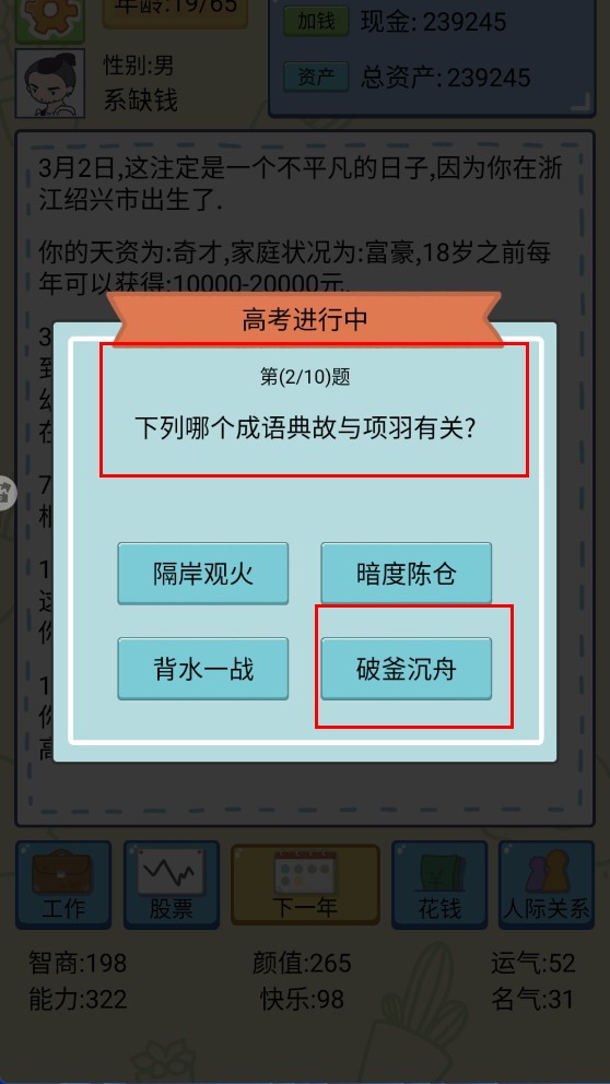 4、高考答题时,面对项羽相关成语题,选择【破釜沉舟】为正确答案,可顺利通过高考环节推进人生进程。