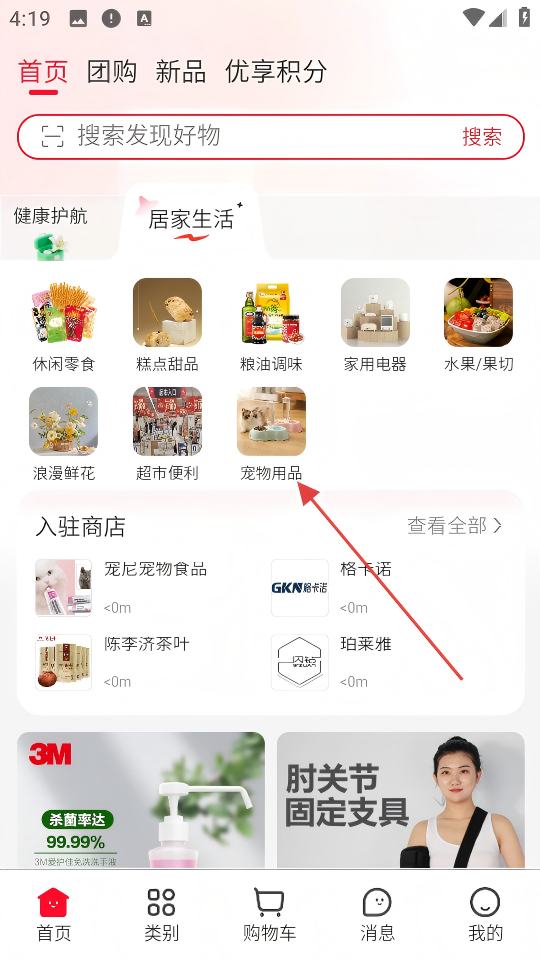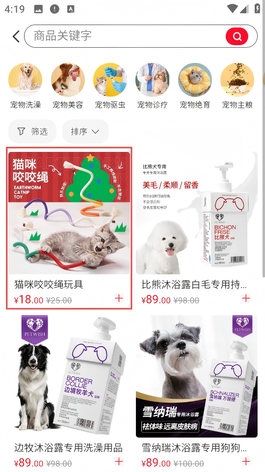 1、打开应用,在首页选择【宠物用品】分类,进入宠物用品商品列表。