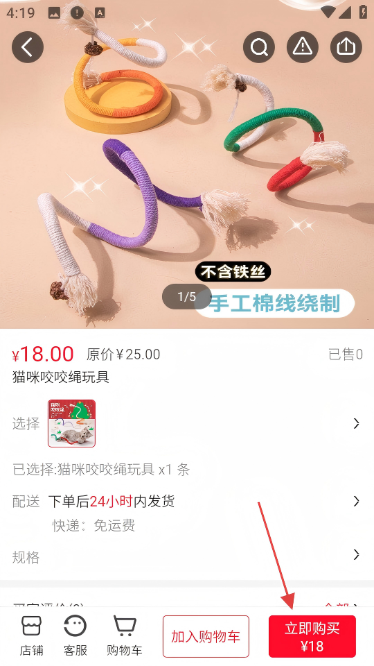 2、在宠物用品商品列表中,选择想要购买的商品,如【猫咪咬咬绳玩具】,点击进入商品详情页。