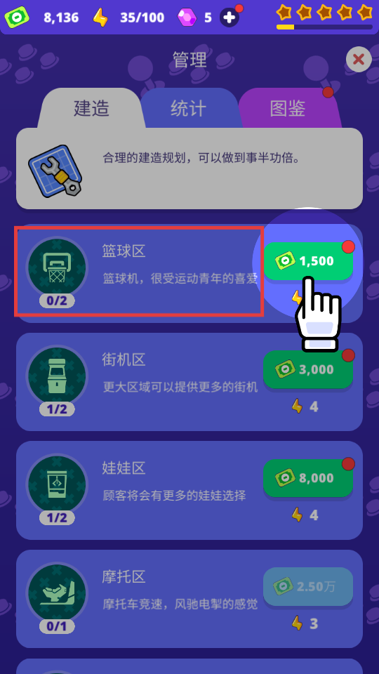 1、在建造界面,花费【1500】金币解锁篮球区,吸引运动青年,丰富电玩城项目以提升顾客吸引力。