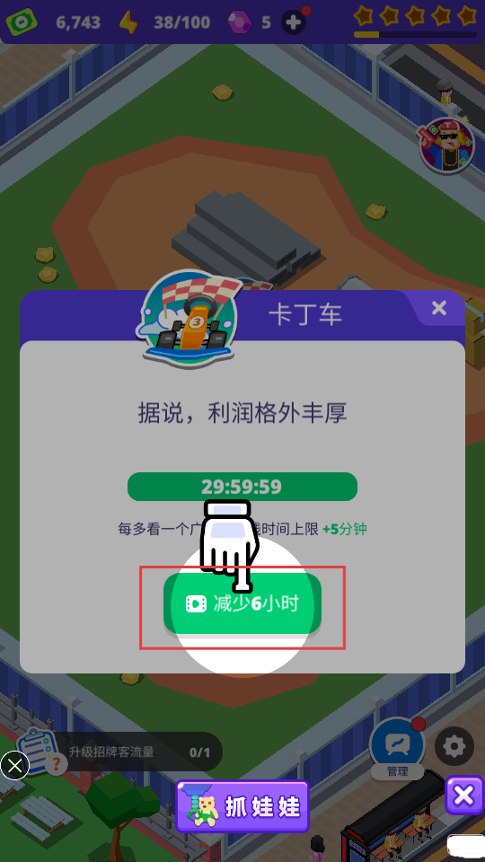 2、卡丁车项目倒计时【29-59-59】,点击“减少6小时”按钮(观看广告),可加速获得丰厚利润。