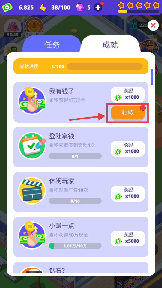 3、“我有钱了”成就达成,点击【领取】按钮,获得【1000】金币奖励,用于电玩城后续经营升级。