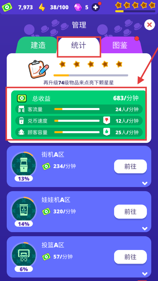 4、进入【统计】界面,查看总收益【683/分钟】等数据,升级74级物品以点亮下颗星星,优化电玩城经营。