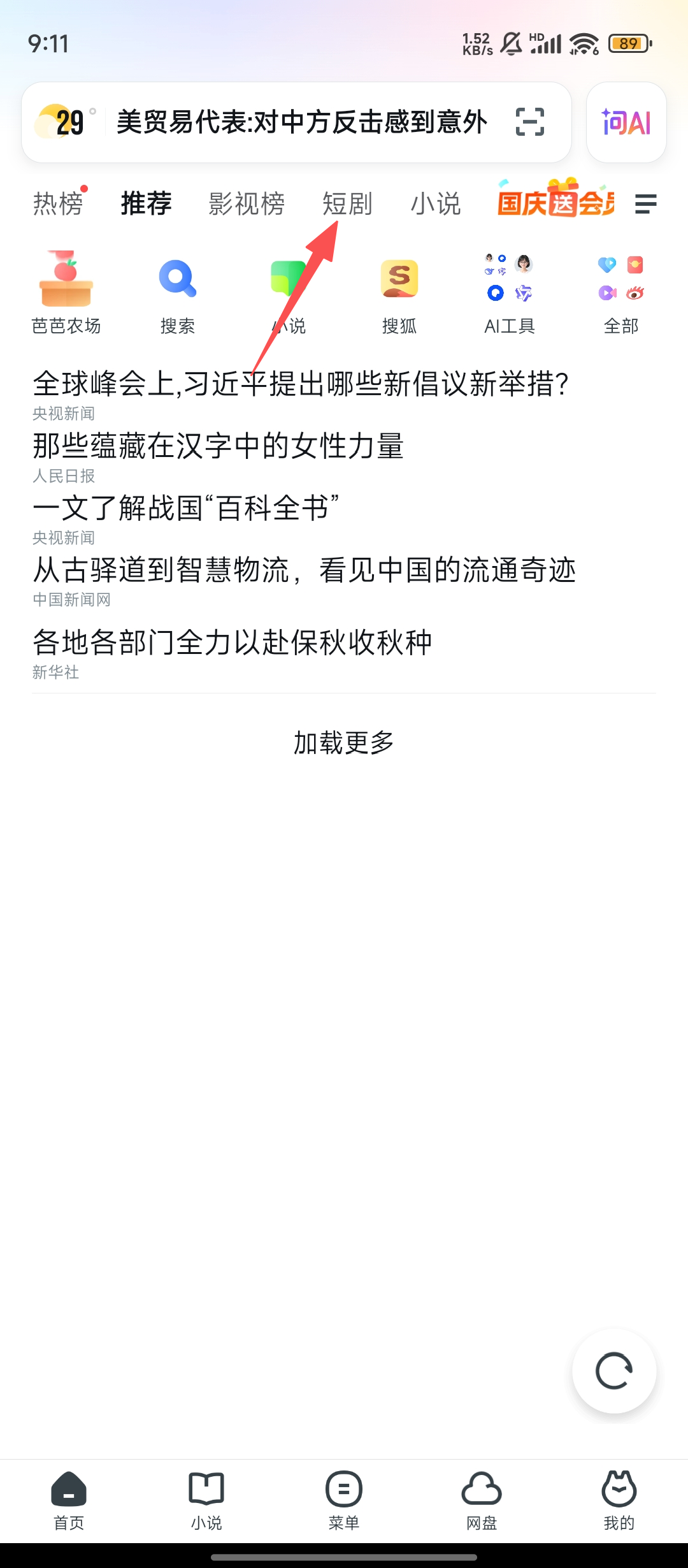 1、打开UC浏览器后,在首页找到并点击【短剧】标签,进入汇聚海量短剧资源的专属频道。