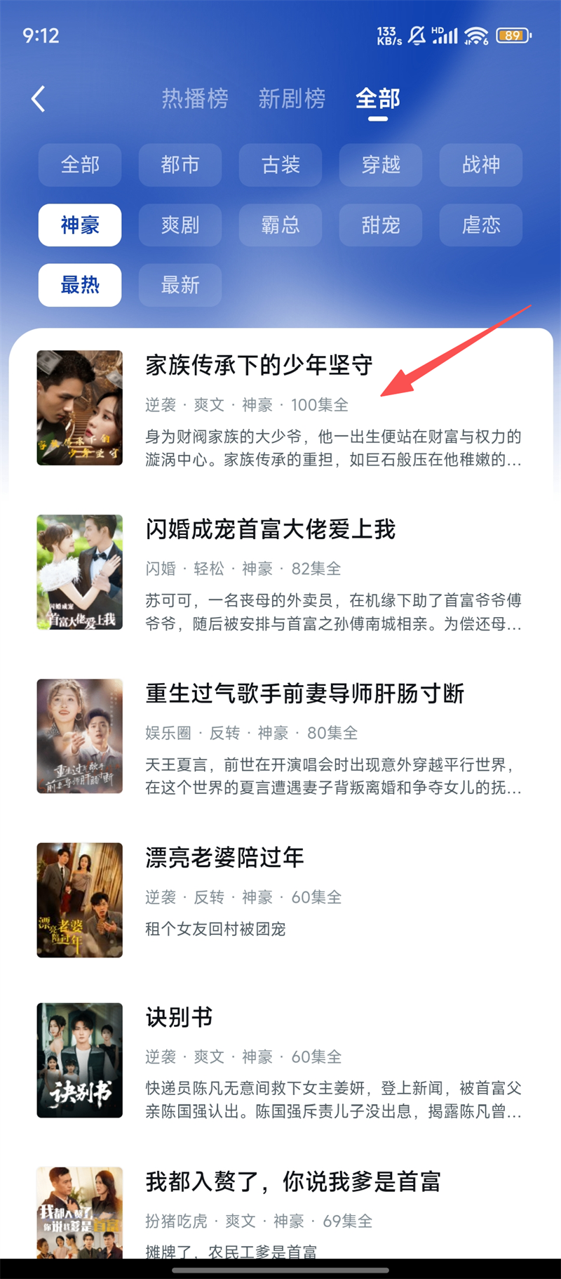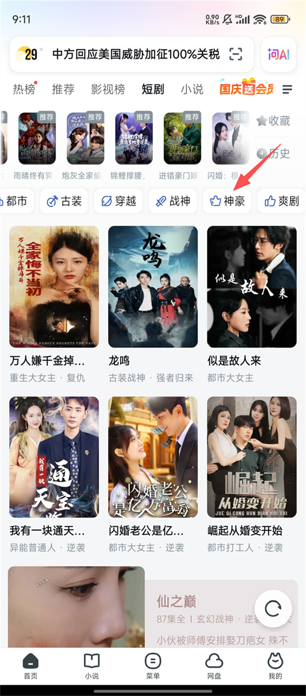 2、进入短剧频道后,点击【神豪】、【爽剧】等题材分类标签,快速筛选出对应类型的短剧。