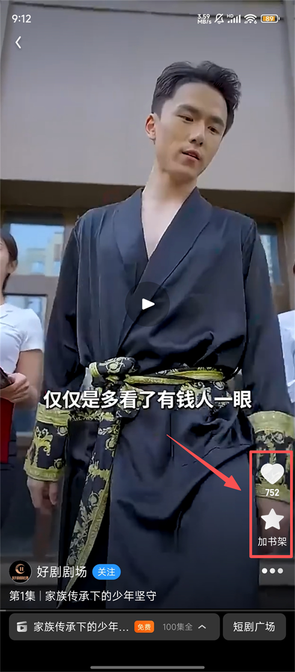 4、进入短剧播放页后,还可点击右侧【爱心】或【加书架】按钮,进行点赞或收藏操作呢。