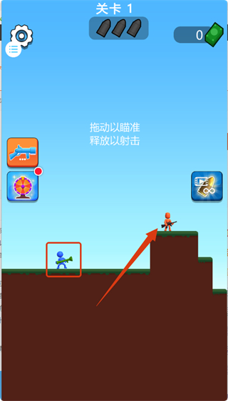 1、在【关卡1】中,按照“拖动以瞄准-释放以射击”的提示,瞄准敌方橙色角色,利用武器发起攻击,开启战斗。