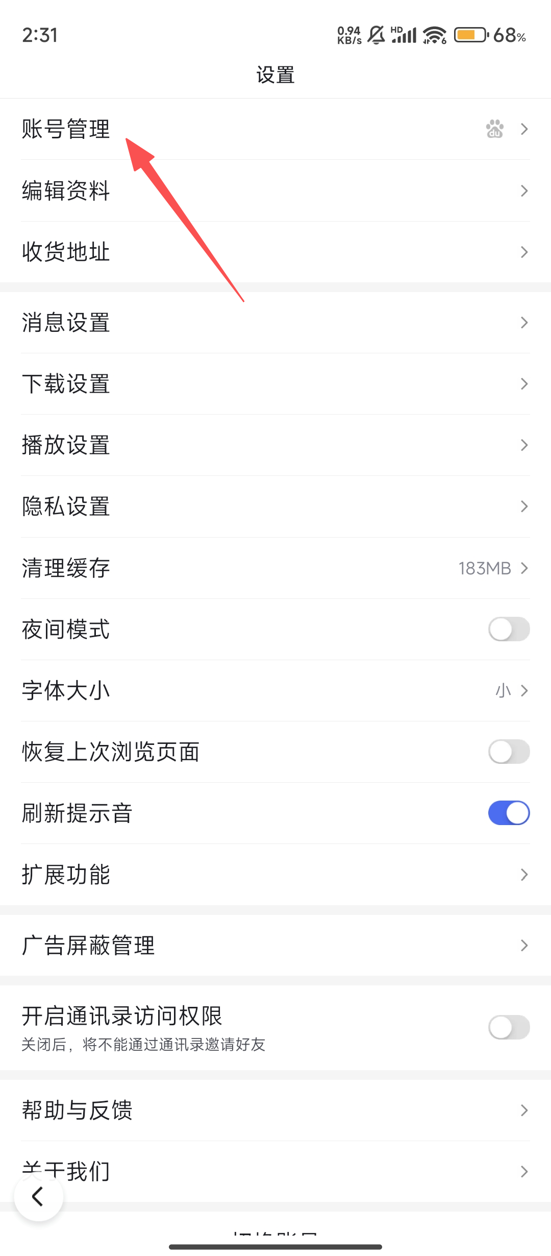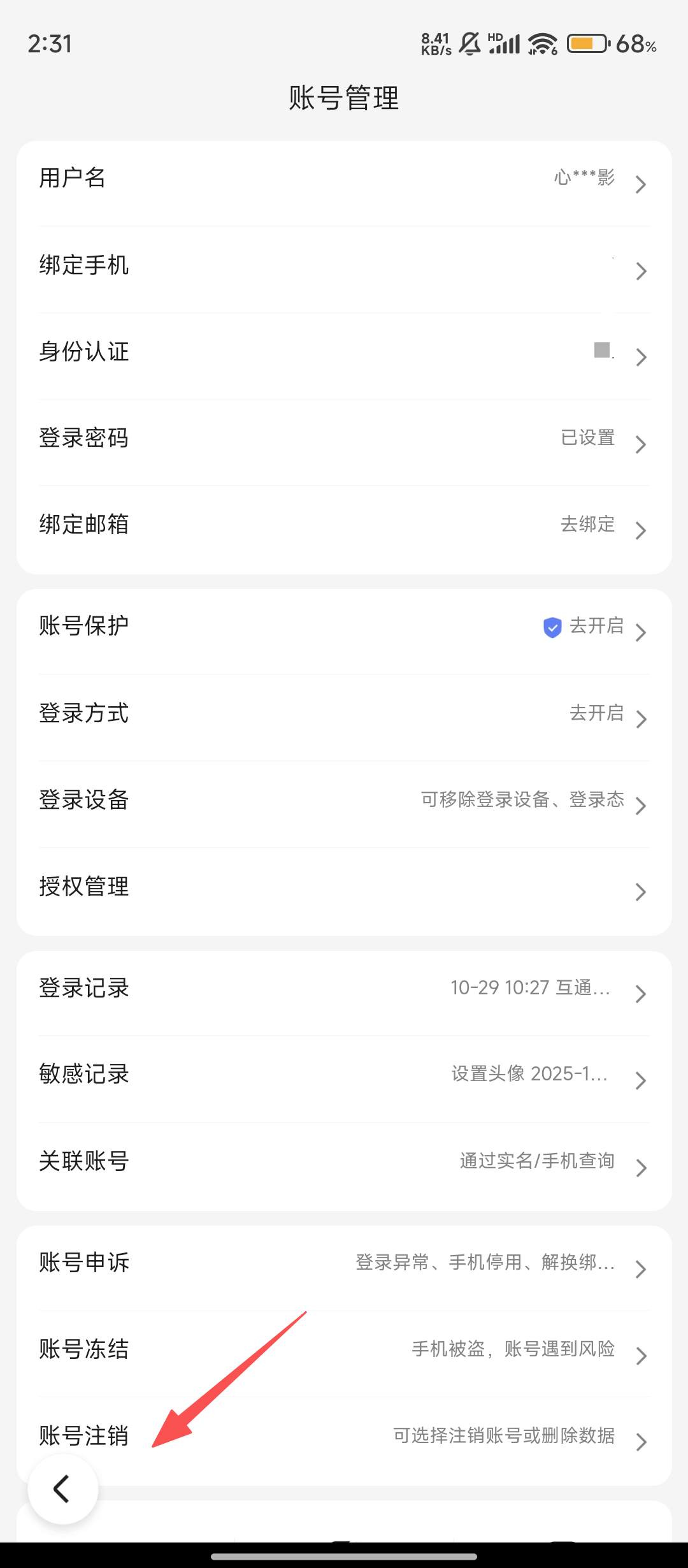 2、在【账号管理】页面找到【账号注销】选项并点击,继续推进注销步骤呢。