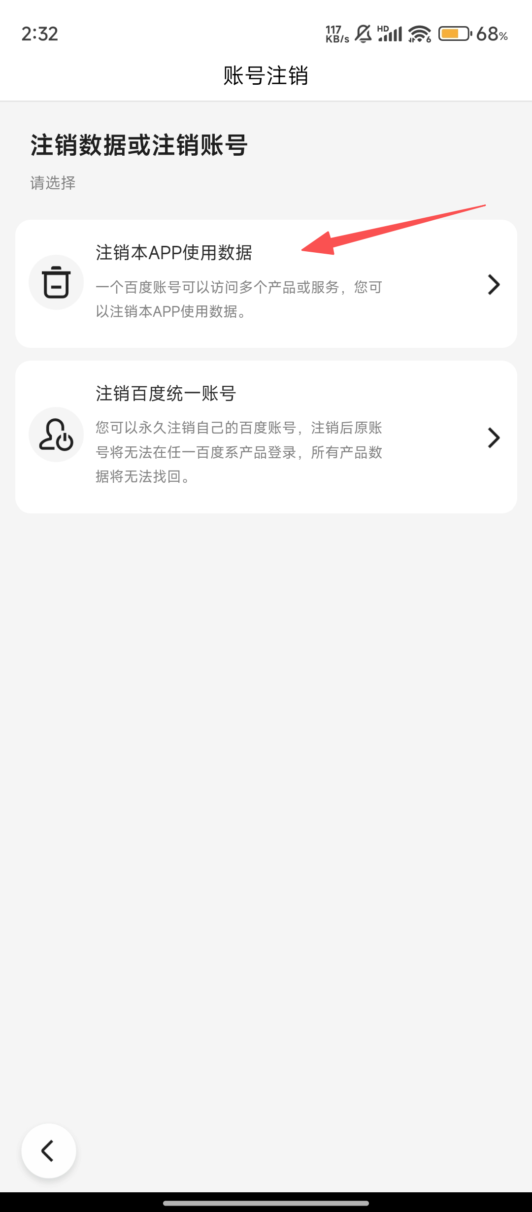 3、进入【账号注销】页面,选择【注销本APP使用数据】,按需选择很重要哦。