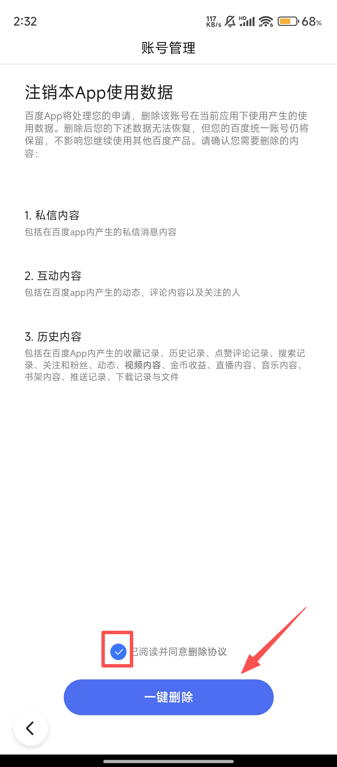 4、阅读并同意删除协议后,点击【一键删除】,即可完成本APP数据的注销啦。