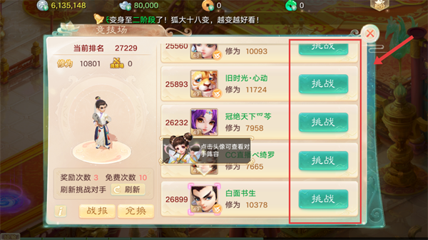 3、选择目标对手,点击【挑战】,发起竞技挑战。