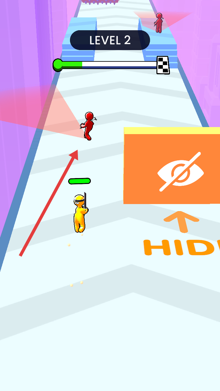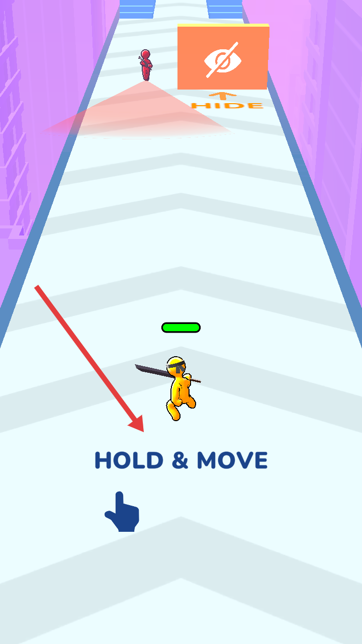 1、按住并移动屏幕HOLD&MOVE,操控黄色忍者角色在赛道上前进,躲避红色敌人的视线。