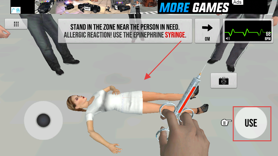 1、当患者过敏反应时,靠近患者,使用【肾上腺素-注射器】,点击【USE】按钮急救。