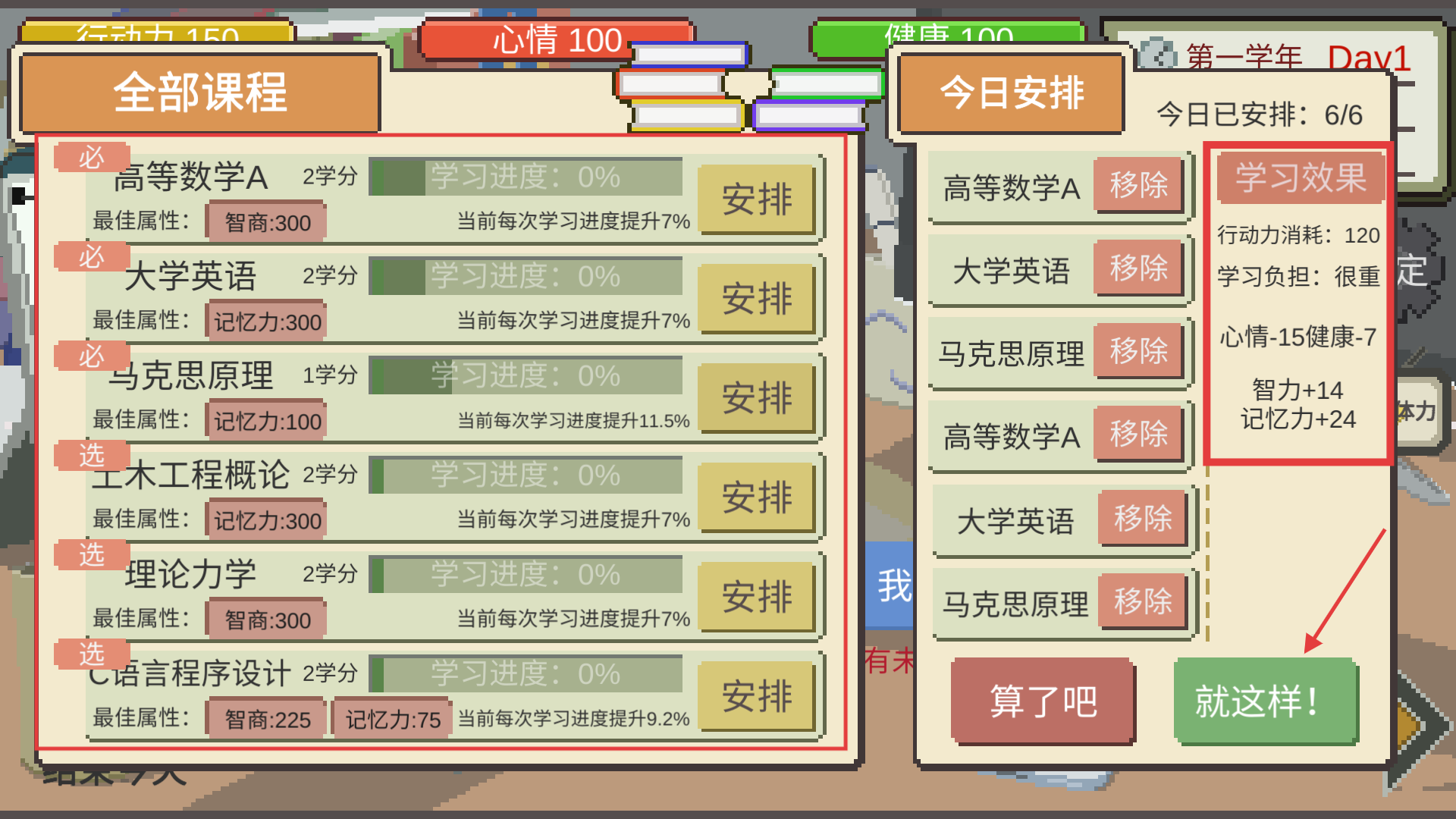 1、在课程界面安排【高等数学A】-【大学英语】-【马克思原理】等课程,查看学习效果调整,平衡属性与压力。