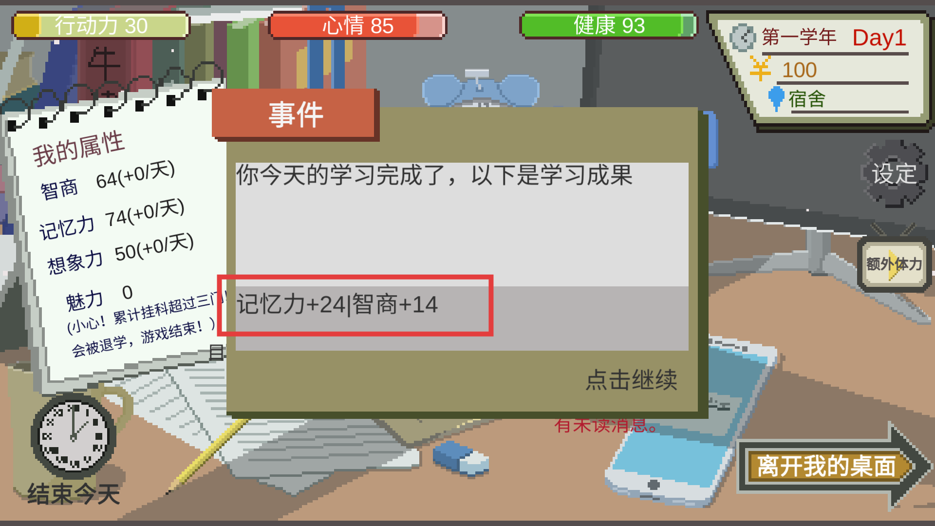 2、完成今日学习后查看事件界面,可获得【记忆力+24】-【智商+14】的属性提升,点击继续推进。