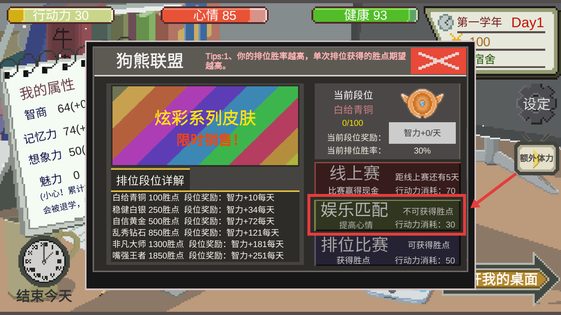 3、在【狗熊联盟】界面选娱乐匹配,消耗行动力提升心情,同时关注段位奖励与胜率变化。