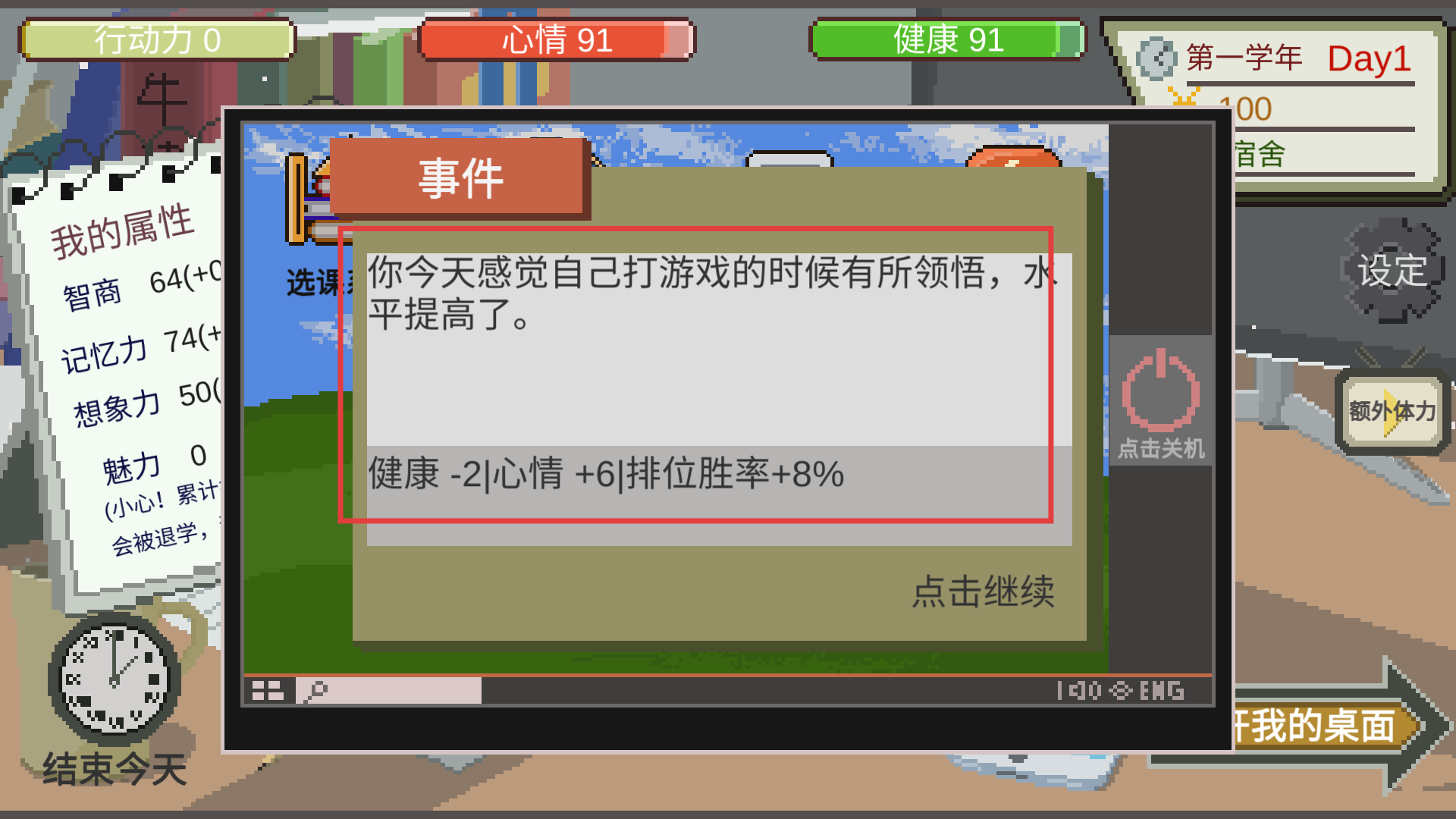 4、打游戏后触发事件,健康-2但心情+6且排位胜率+8%,合理安排游戏平衡状态。