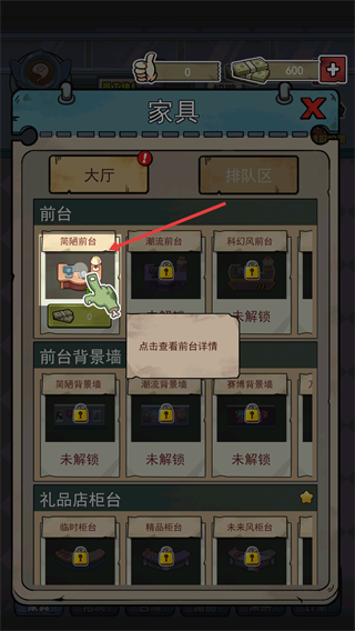 3、在家具界面的“大厅”分类下,点击“简陋前台”选项。